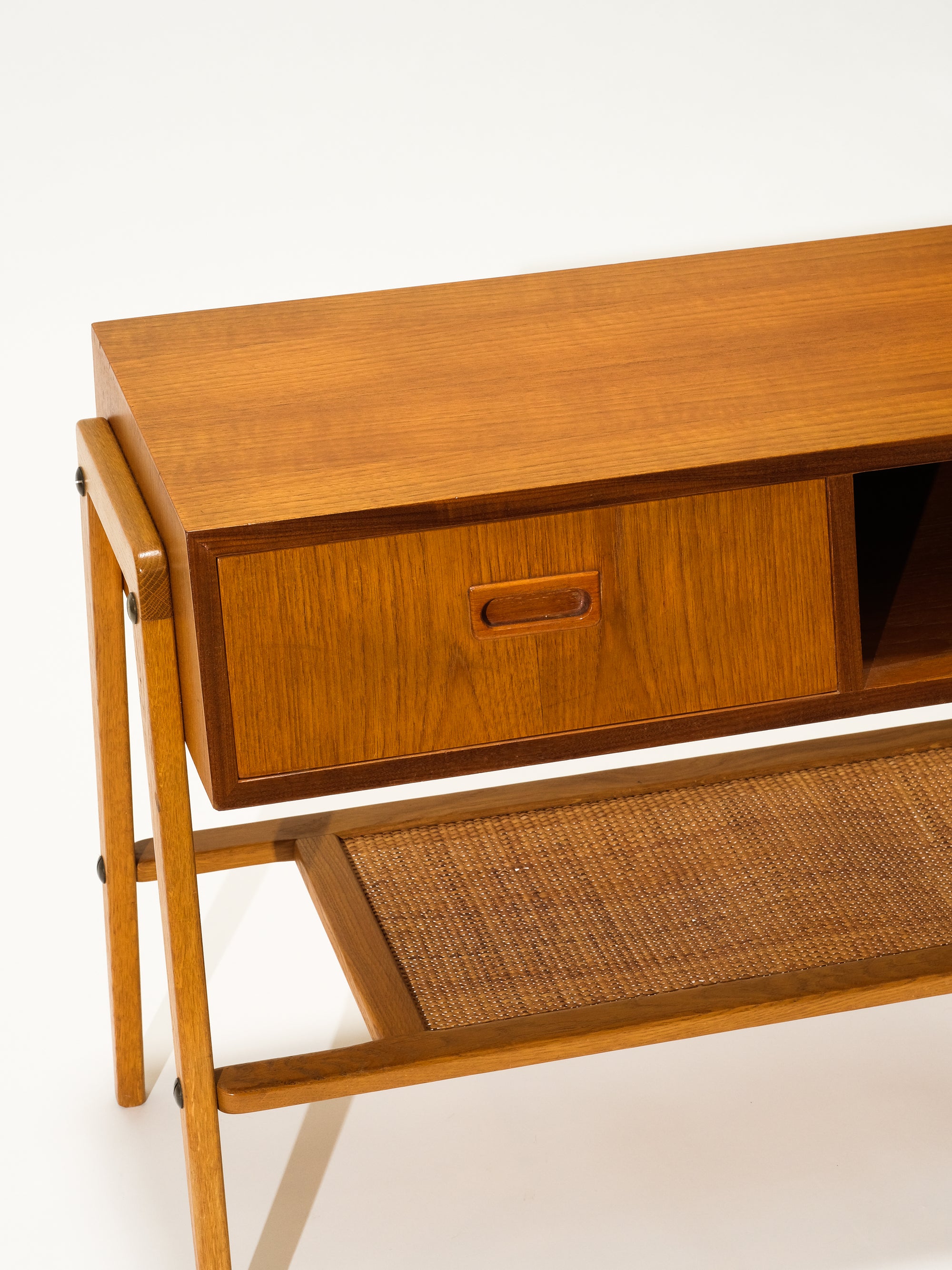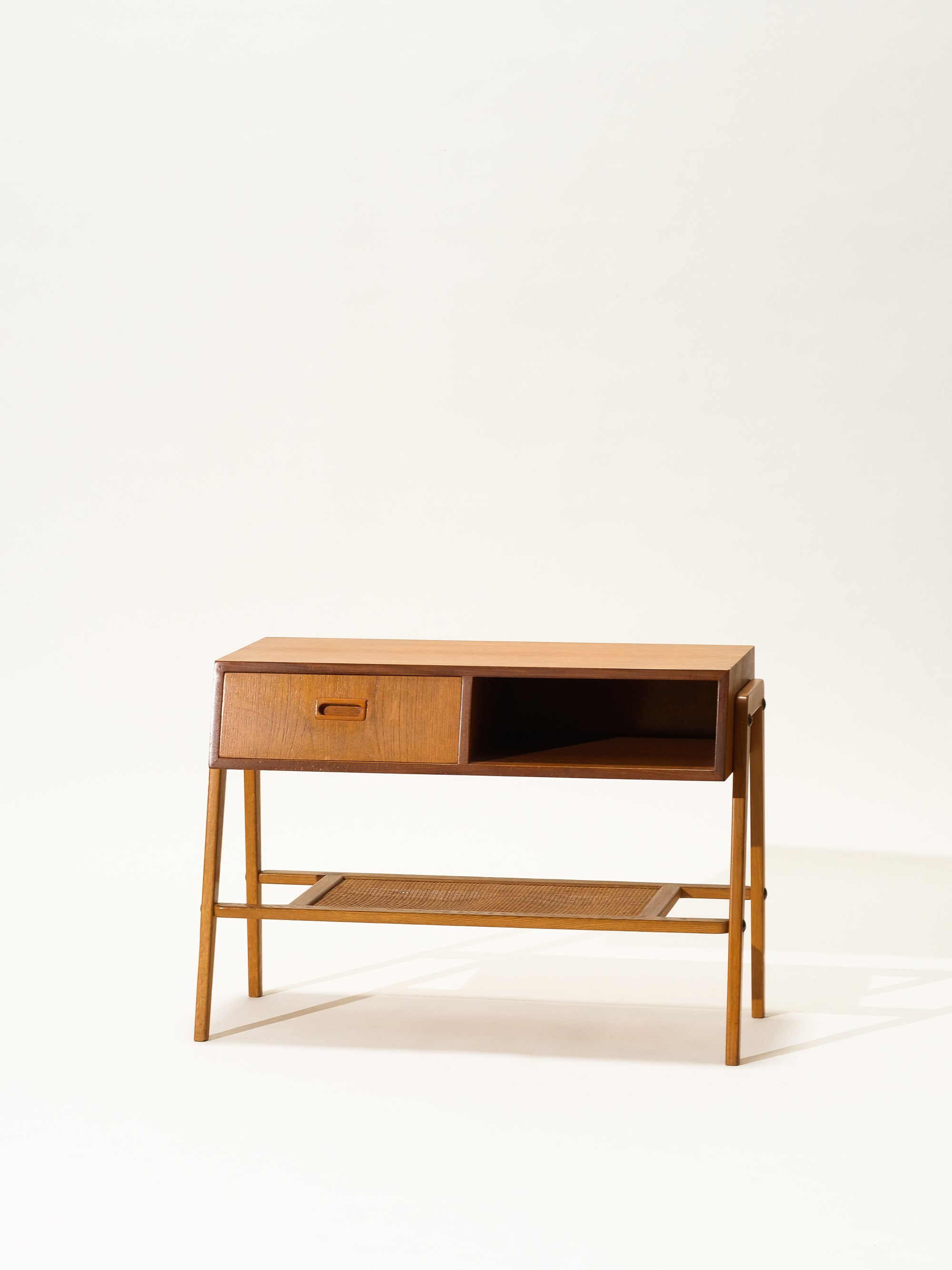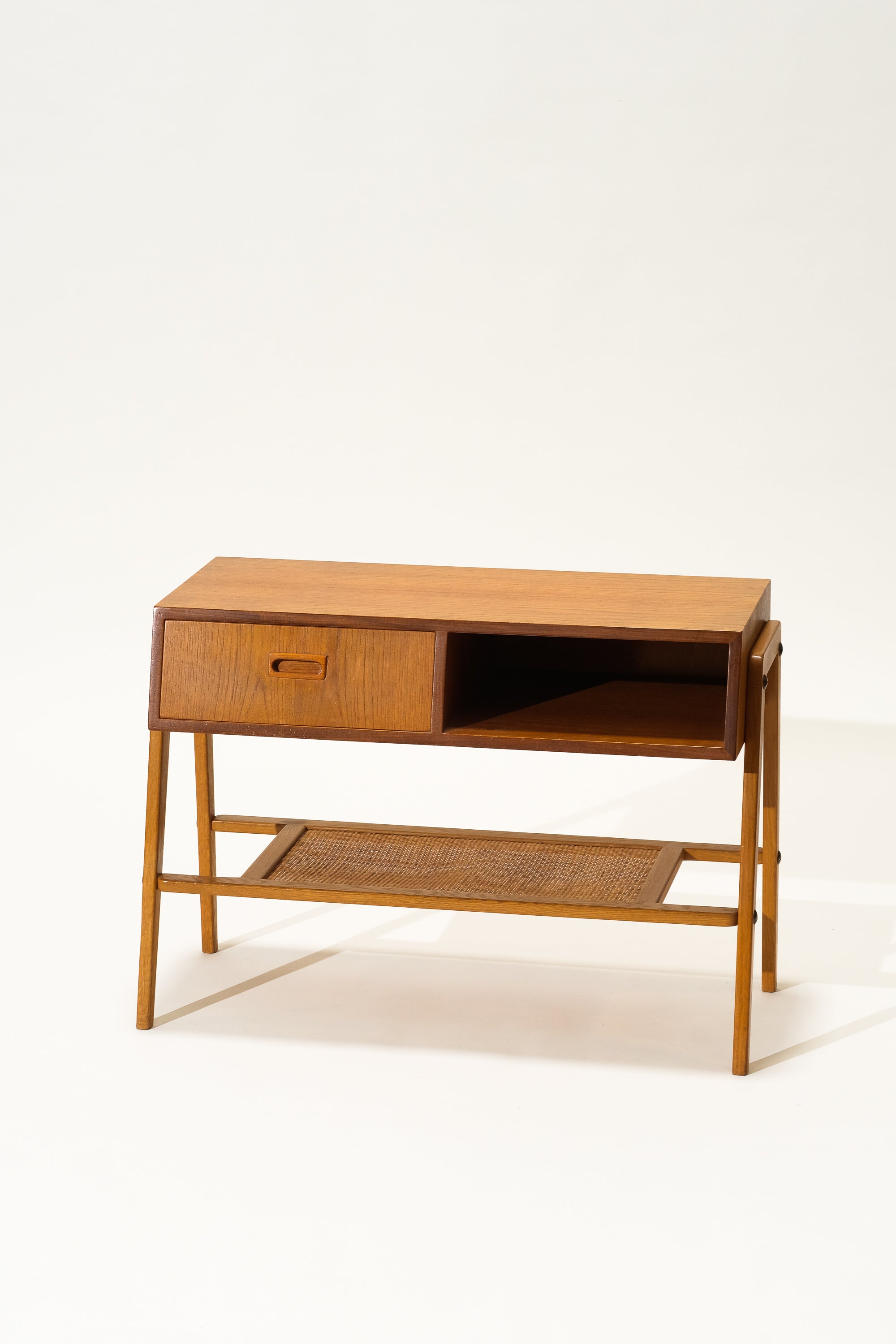 Mid-Century Teak & Oak Side Table with Drawer and Rattan Shelf