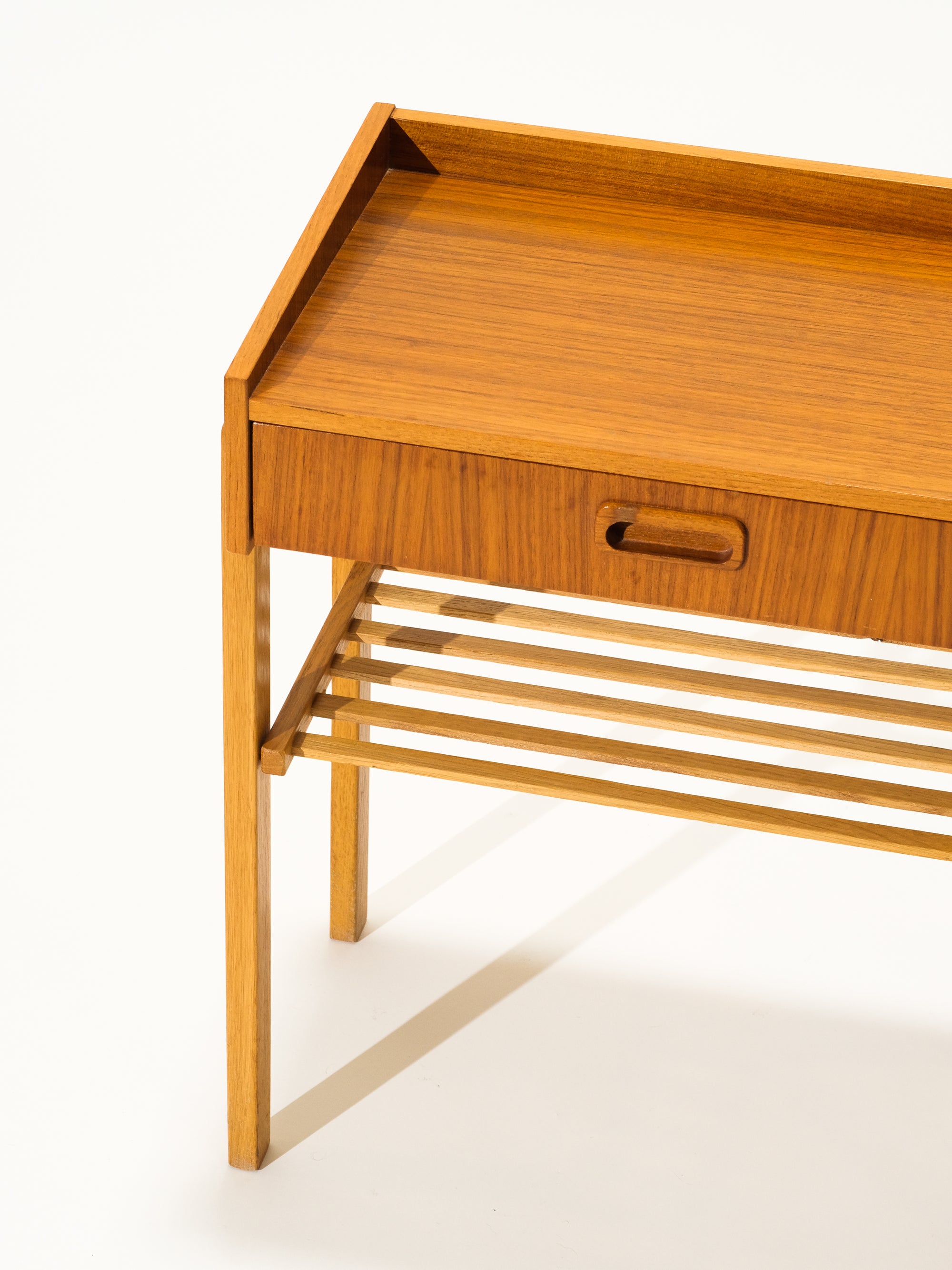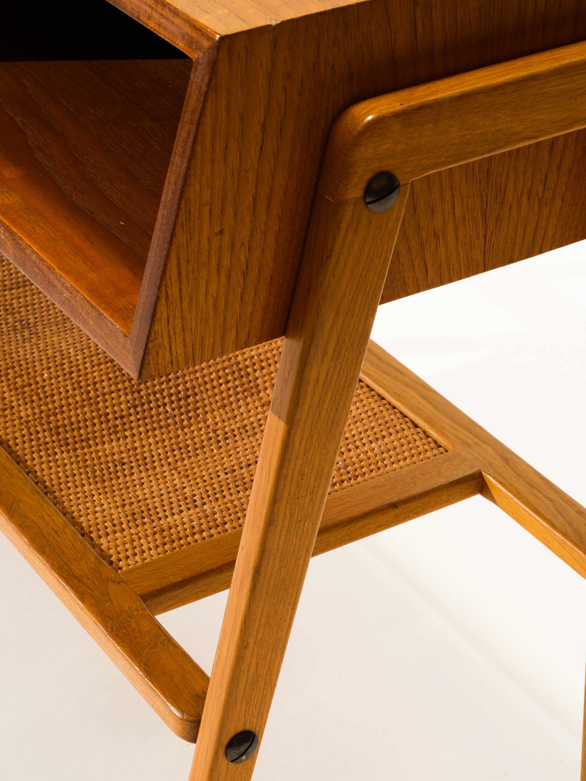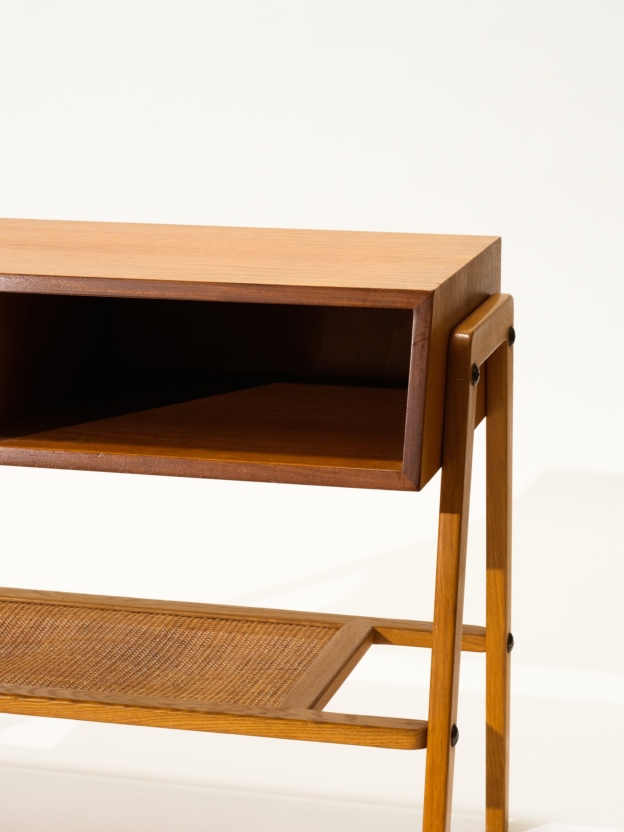 Mid-Century Teak & Oak Side Table with Drawer and Rattan Shelf